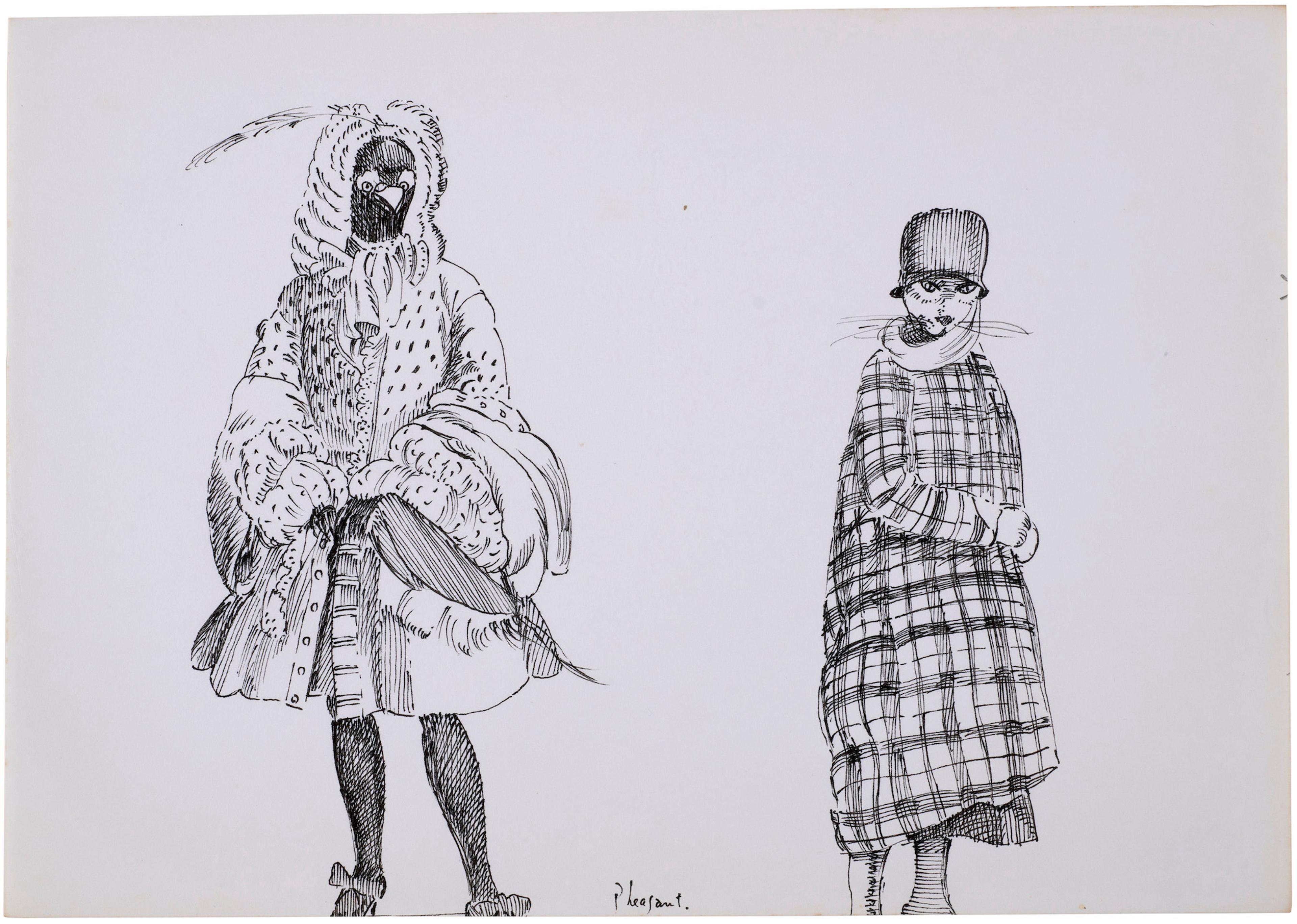 Ayer often used a sketchbook to record her observations and ideas for book narratives and fashion designs. The context for this drawing is unknown.
