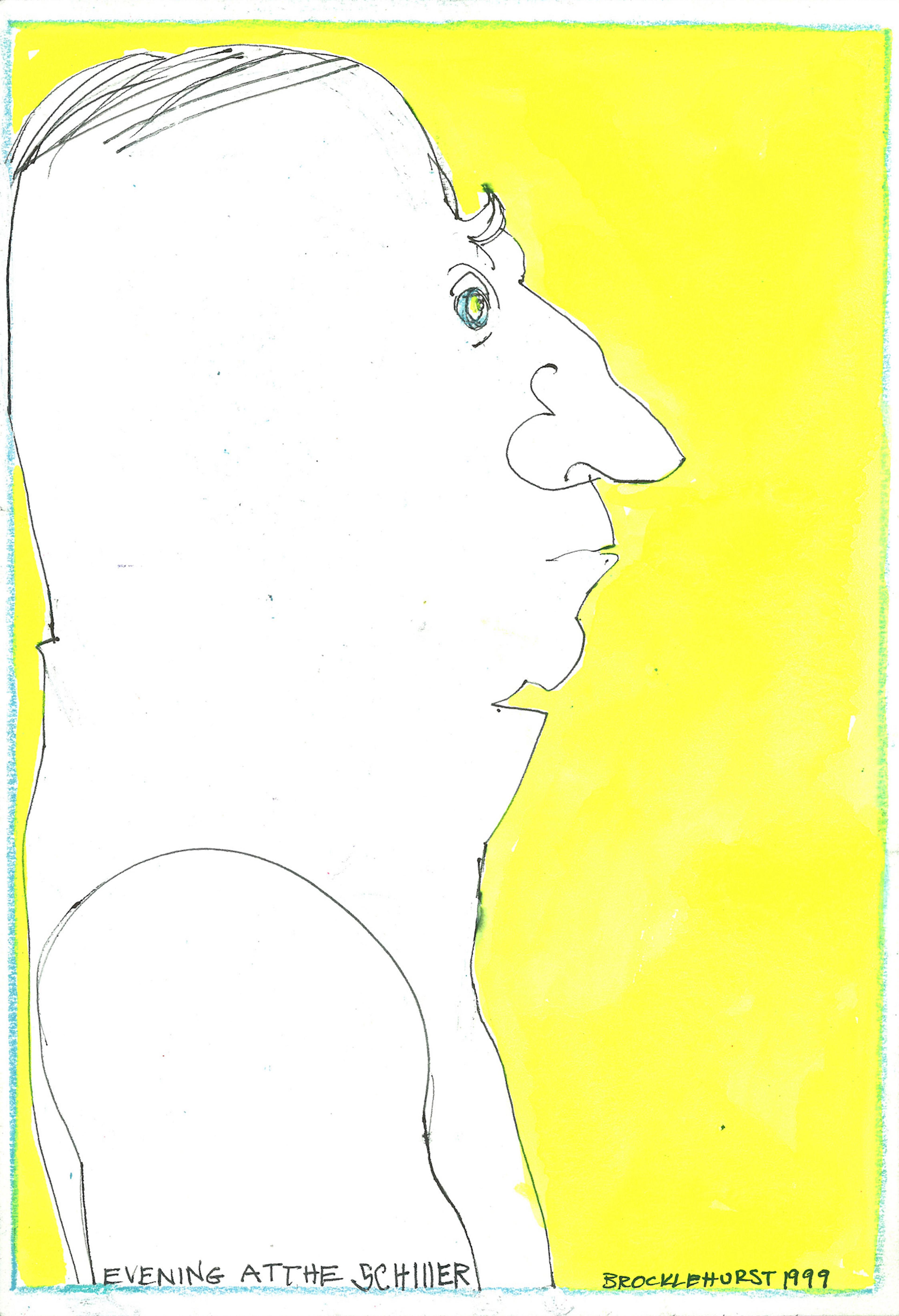In 1999, Brocklehurst was artist in residence at newspaper Berliner Zeitung during Berliner Theatertreffen, a festival of new German theatre. The paper wanted to revive the Weimar tradition of theatre reviews being accompanied by illustrations, rather than using photographs. Brocklehurst drew behind the scenes and from her seat during performances. This drawing may have been made during the interval of a performance of play Die Eingeborene at the Schiller Theatre.