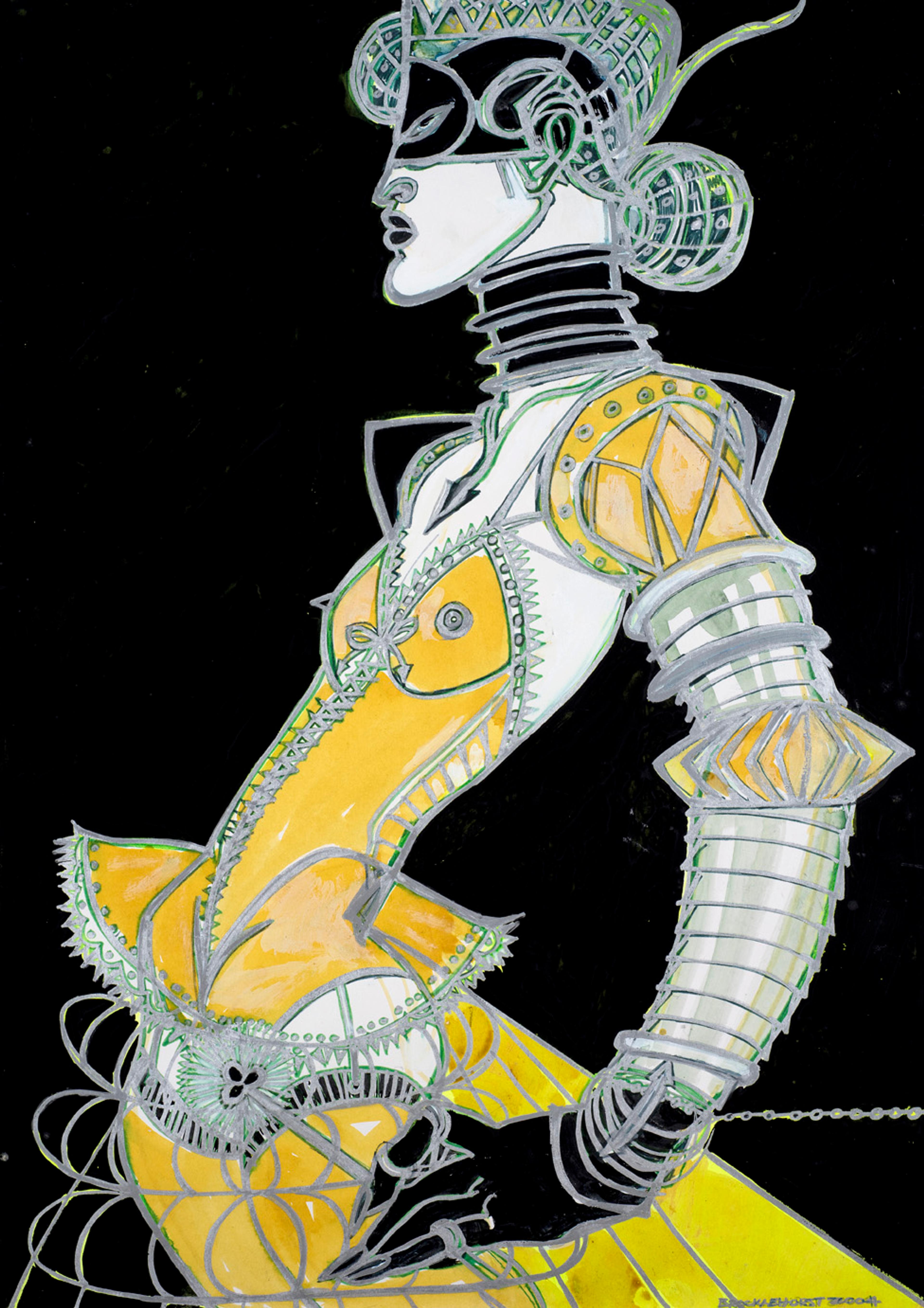 This work is from Brocklehurst Through the Looking-Glass, Brocklehurst’s final series. With an image of herself as a child as the centrepiece, Brocklehurst made hundreds of drawings that re-imagined characters from Lewis Carroll’s Alice novels. Her models were friends and dedicated club-goers who designed and made their own clothes.