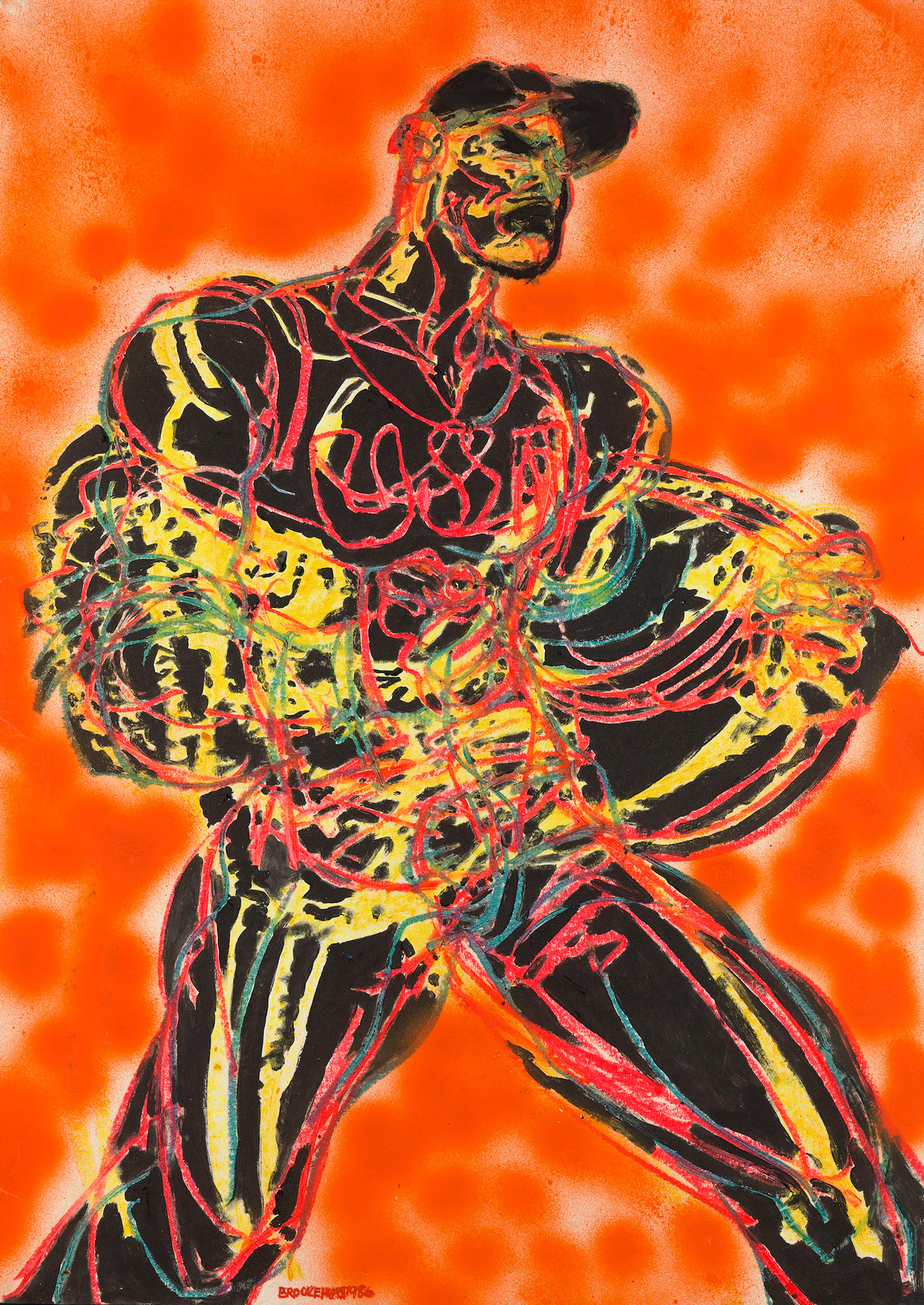 Brocklehurst began working in New York following an exhibition of her work there in 1983. She took paper and materials to the gay nightclubs of the Meatpacking District, drawing clubgoers like this one. Brocklehurst used neon inks that she could see under the ultraviolet lights.